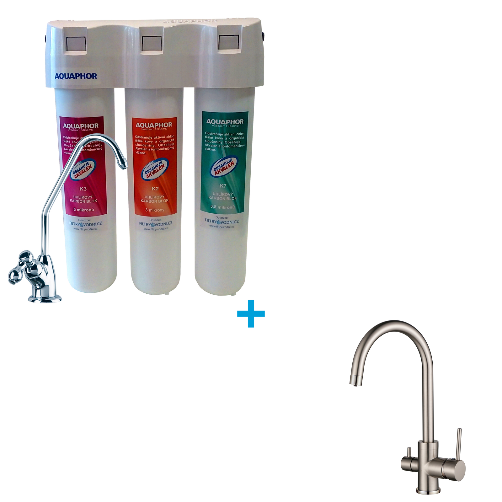 Poznámka: Pokud nechcete mít samostatný kohoutek a vrtat díru do kuchyňské desky, můžete si k filtru dokoupit trojcestnou baterii. Od klasického kohoutu se liší tím, že má připojení jak na teplou a studenou vodu, tak i na filtrovanou. Na čerpání filtrované vody obsahuje přepínač navíc.